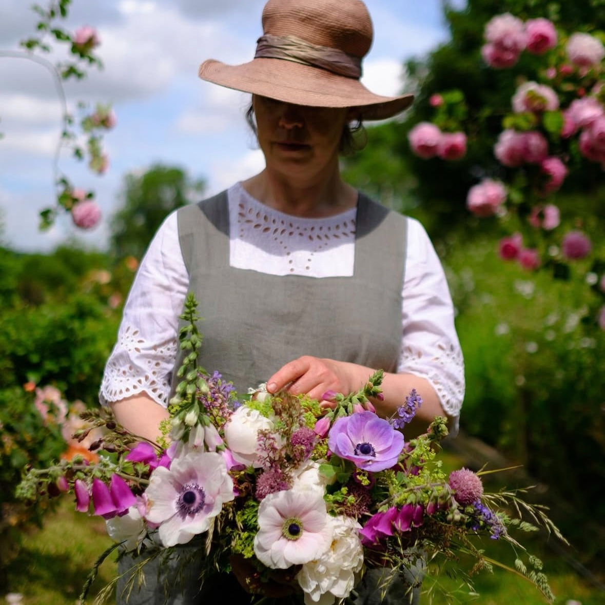 She grows flowers in her canalside cutting garden, forages responsibly from British hedgerows, and designs bespoke wild garden-style arrangements for weddings and events.